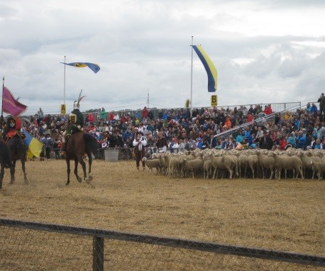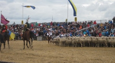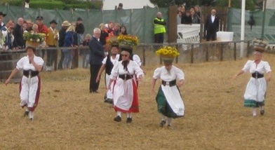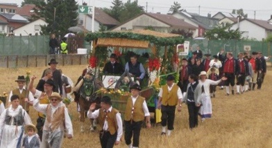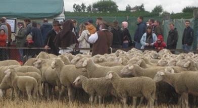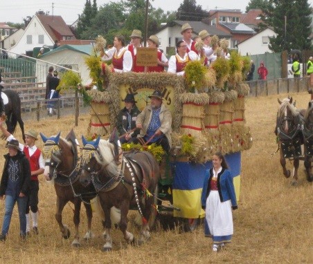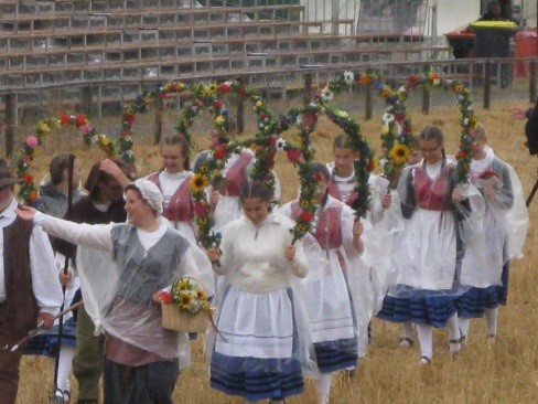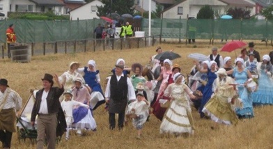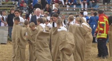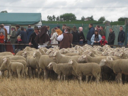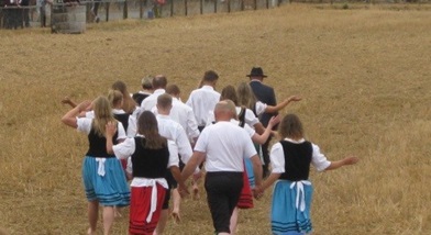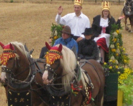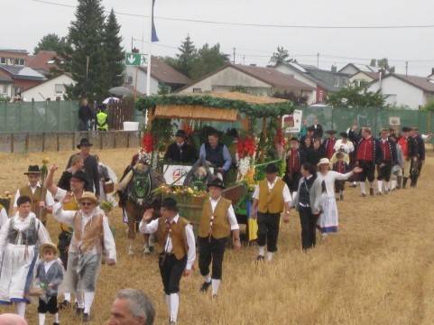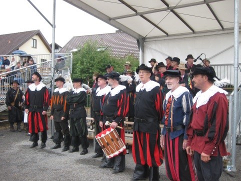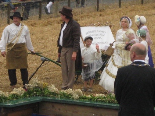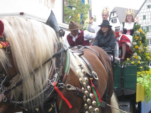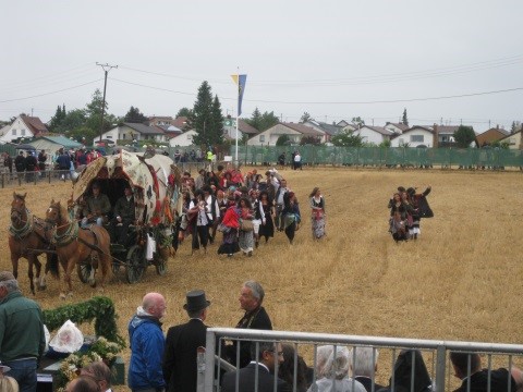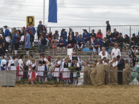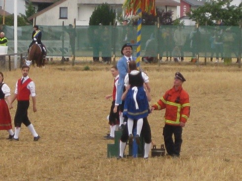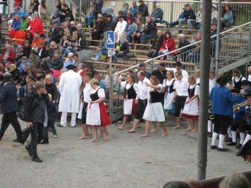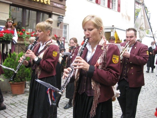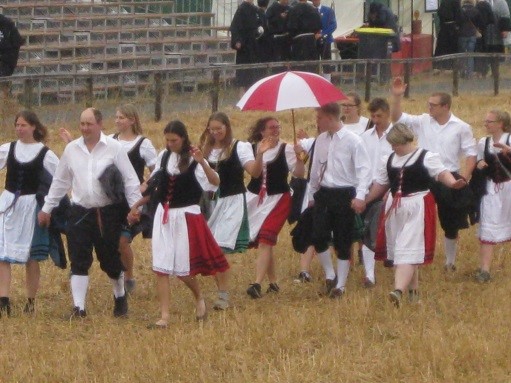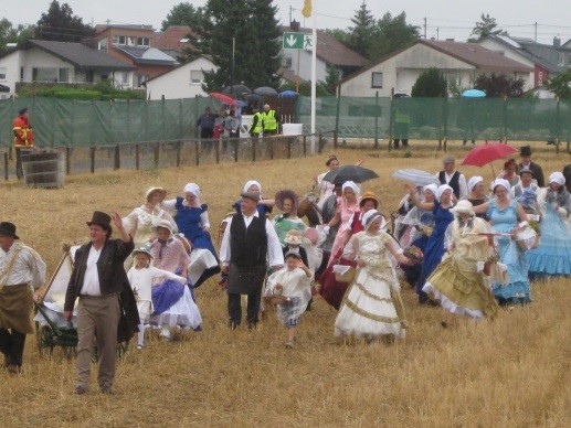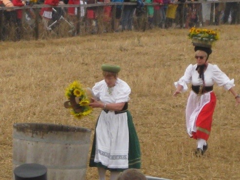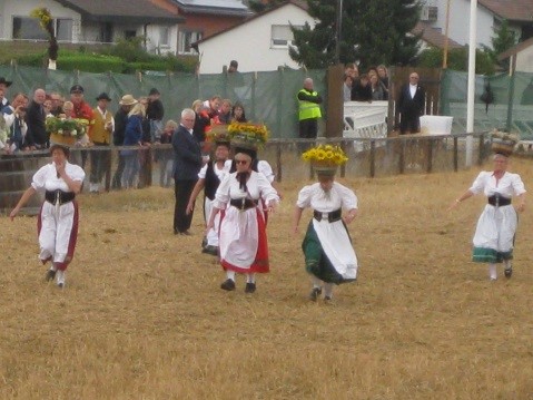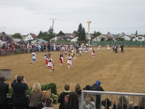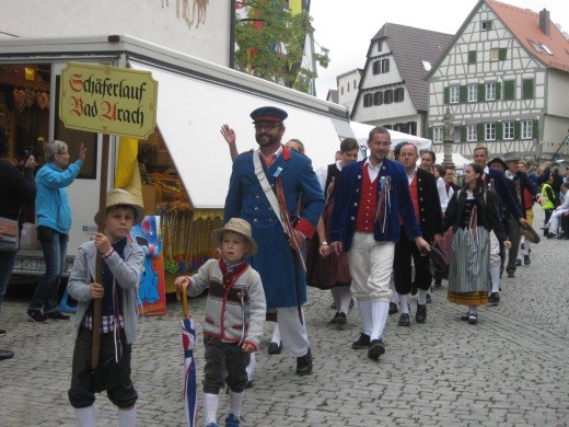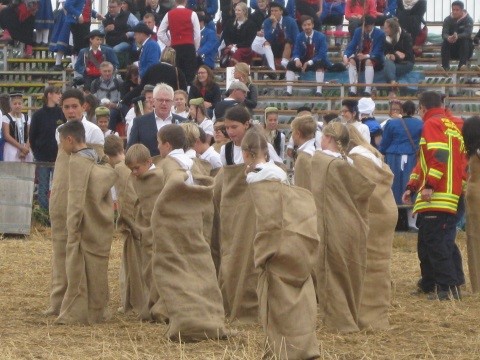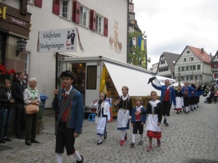 Beginn für uns war auf dem Rathausplatz, wo wir den farbenprächtigen Festzug mit vielen Musikvereinen und zahlreichen Trachtengruppen anschauten. Danach ging es weiter durch die Gassen der Altstadt, in denen es Stände mit den verschiedensten Sachen gab, weiter zum Stoppelfeld. Dort begannen die Feierlichkeiten mit der Begrüßung des Festumzuges. Anschließend sahen wir ein szenisches Spiel über die Sage vom Ursprung des Schäferlaufs in Markgröningen vor vielen 100 Jahren. Danach folgten das Sacklaufen, bei der die markgröninger Kinder ihre Geschicklichkeit beweisen konnten; der Hahnentanz, bei dem im Walzertakt die Tanzpaare versuchen, einen gefüllten Wasserbecher mit dem Kopf umzuwerfen, ohne selbst nass dabei zu werden; das Wassertragen, ein althergebrachter Wettlauf der Frauen über das Stoppelfeld mit vollen Wasserkübeln und endlich das Highlight des Tages, dem Wettlauf der Schäfer und Schäfermädchen barfuß auf dem 300 Schritt langen Stoppelfeld! Leider wurde der Wettlauf durch einen ordentlichen Regenschauer unterbrochen, bei dem alle ziemlich nass wurden. Zum Glück war dieser schnell vorüber und die Schäfer und Schäfermädchen konnten den Wettlauf über das ziemlich matschig gewordene Stoppelfeld fortsetzen. Die jeweiligen Gewinner wurden zum Schäferkönig und zur Schäferkönigin gekrönt und zu Ehren des Königspaars gab es einen farbenfrohen, figurenreichen Reigentanz.
